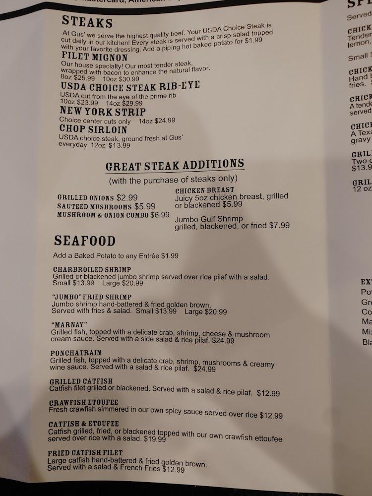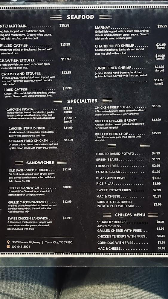 Welcome to Gus' Restaurant, your ultimate dining destination in Texas City for hearty steaks, fresh seafood, and mouthwatering BBQ. Located at 3503 Palmer Hwy, we offer a cozy atmosphere perfect for families and friends alike. Our extensive menu features traditional favorites, paired with a selection of drinks including cocktails, wines, and craft beers. Enjoy our happy hour specials and savor dishes in our comfortable seating or opt for takeout. Accessible amenities ensure all guests can enjoy their experience, making Gus' a great spot for any occasion. Join us for lunch or dinner and taste the flavors that keep our community coming back!