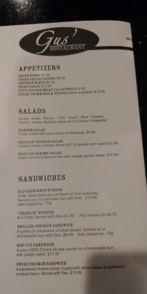 Gus’ menu offers a wide range of options, from hearty steaks to casual sandwiches. The chicken piccata and fried catfish are favorites among guests. Those craving lighter fare can explore the several salads available, including the garden salad and limited offerings for kids.